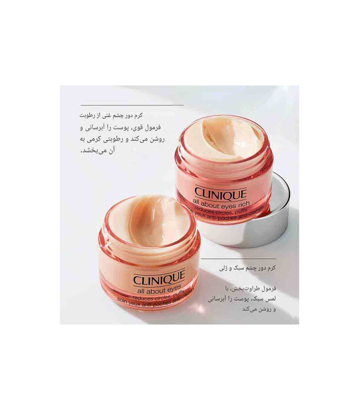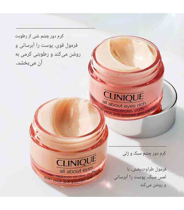 اگر به دنبال یک کرم دور چشم سبک و مؤثر هستید که تیرگی و پف را کاهش دهد، کرم All About Eyes از برند لوکس کلینیک، یکی از بهترین گزینهها است. این کرم ژلی-کرمی با بافتی سبک و زودجذب، پوست حساس اطراف چشم را آبرسانی کرده و با ترکیبات قدرتمند خود، حلقههای تیره و پف ناشی از خستگی یا کمخوابی را کاهش میدهد.