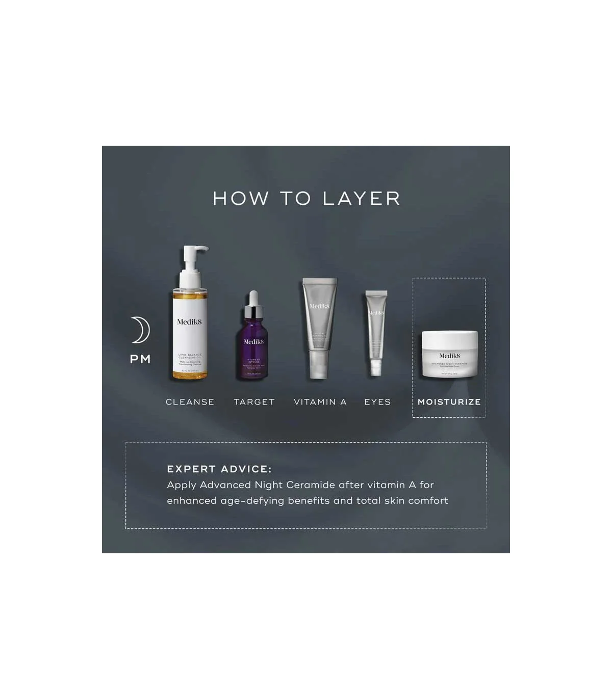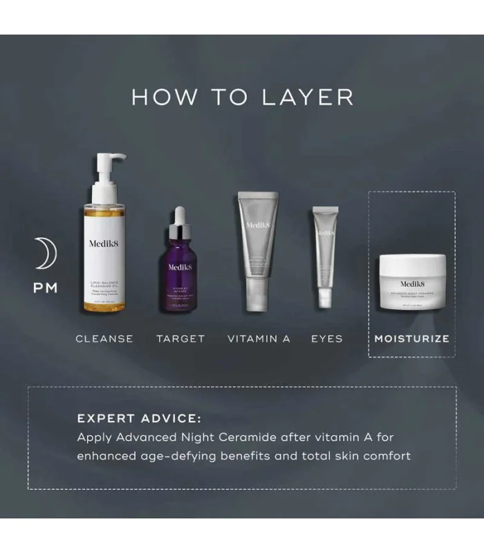 Medik8 Advanced Night Ceramide Cream یک کرم شب پیشرفته است که بهطور تخصصی برای بازسازی، آبرسانی عمیق و مقابله با علائم پیری پوست طراحی شده است. این کرم با ترکیب سرامیدها، اسکوالان و پپتیدهای ضدچروک در زمان خواب، پوست را احیا و بازسازی میکند.